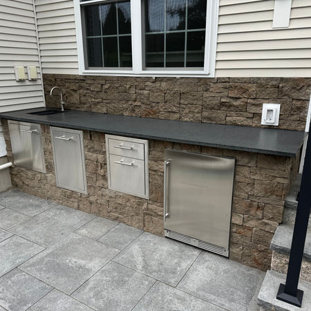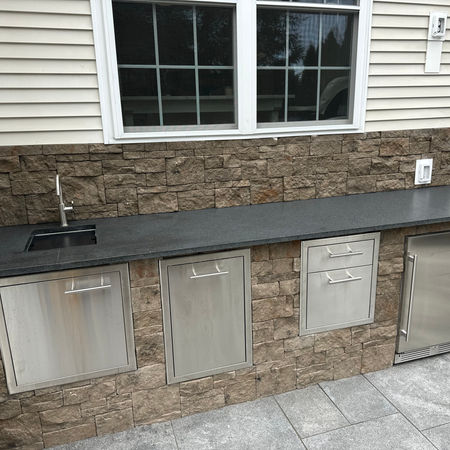 This open space was a question mark for these home owners who love to entertain. Why not have it the way it should be with a EvoStone veneer, granite countertops, stainless accents and beverage fridge. And lets not forget about the entertainment feature with and outdoor TV.